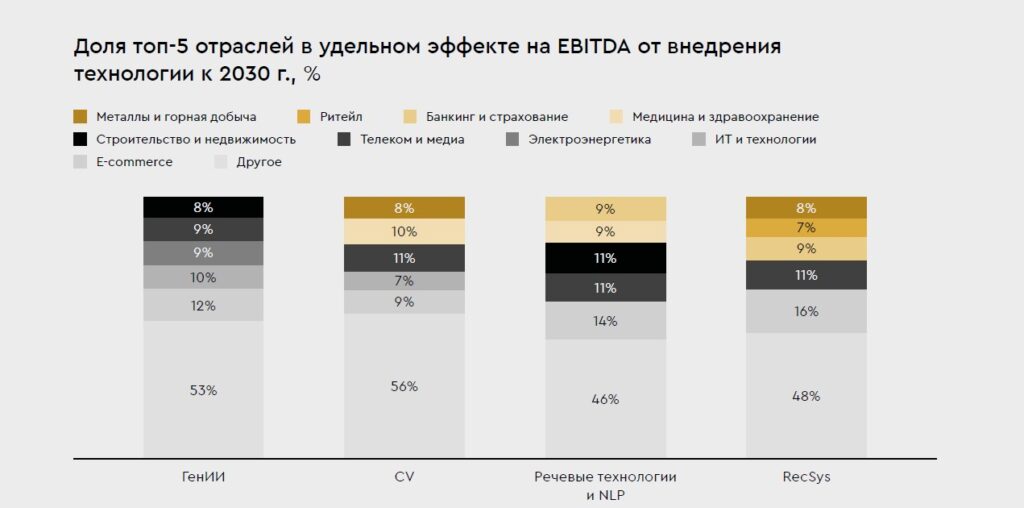 Согласно отчету, более 60% совокупного экономического эффекта в России сосредоточено в пяти ключевых отраслях: e-commerce, телеком и медиа, ИТ и технологии, строительство и недвижимость, а также медицина и здравоохранение. К 2030 г. внедрение ИИ станет вопросом выживания для большинства компаний, уверены авторы исследования. Распределение совокупного эффекта демонстрирует, что максимальную отдачу от инвестиций в ИИ получат те отрасли, где технологии оказывают непосредственное влияние на ключевые бизнес-процессы и модели монетизации.