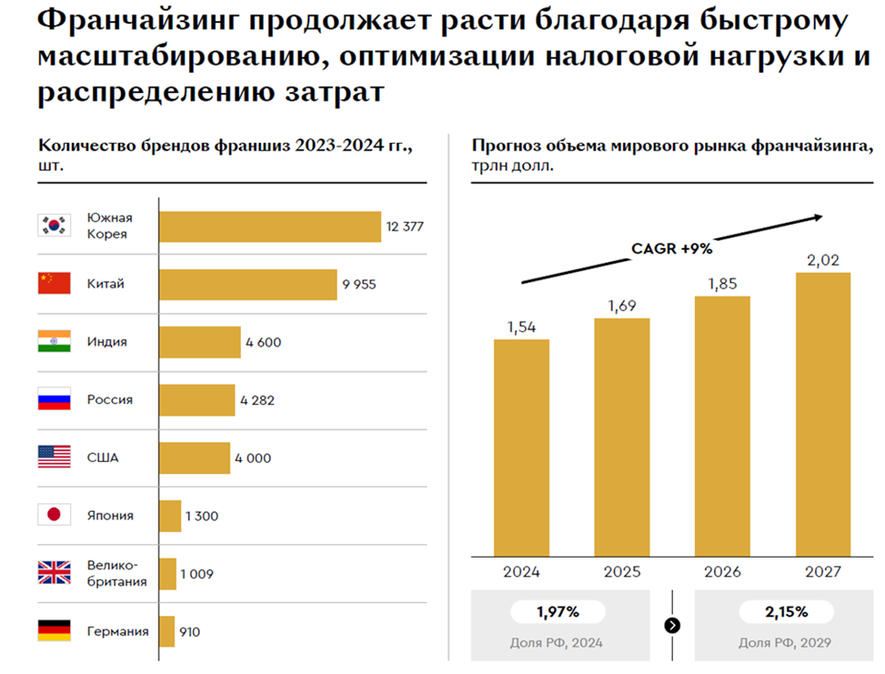 Глобальный рынок также подтверждает долгосрочность этого сдвига. По прогнозу аналитиков, мировой рынок франчайзинга увеличится с $1,54 трлн в 2024 г. до $2,02 трлн в 2027-м, что соответствует среднегодовому темпу роста 9%. По оценке авторов исследования, рост франчайзинга обеспечивается сразу несколькими факторами: быстрым масштабированием, распределением затрат, а также оптимизацией модели владения и управления.