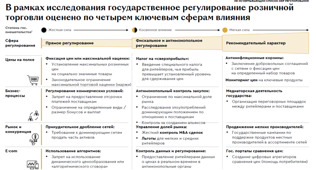 Как полагают эксперты, в условиях того, что франчайзинг становится главным инструментом экспансии, его регулирование должно не подменять рыночную логику, а создавать более предсказуемые и справедливые условия для масштабирования сети. Авторы отчета отмечают, что в большинстве из рассмотренных стран — Бразилии, Китае, Мексике, США, Германии и Польши —государство не делает ставку на жесткое прямое регулирование доли и действий игроков на рынке. Вместо этого используются точечные меры — рассмотрение антимонопольных сделок в индивидуальном порядке, контроль за ростом цен на социально значимые товары, временное снижение НДС, добровольные соглашения с ритейлерами и субсидии производителям.