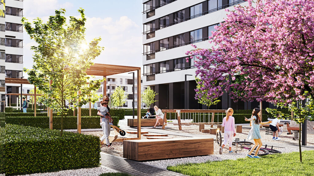 Концепция «двор без машин» перестала быть прерогативой элитных проектов. В жилом квартале «Миндаль» она реализована так: